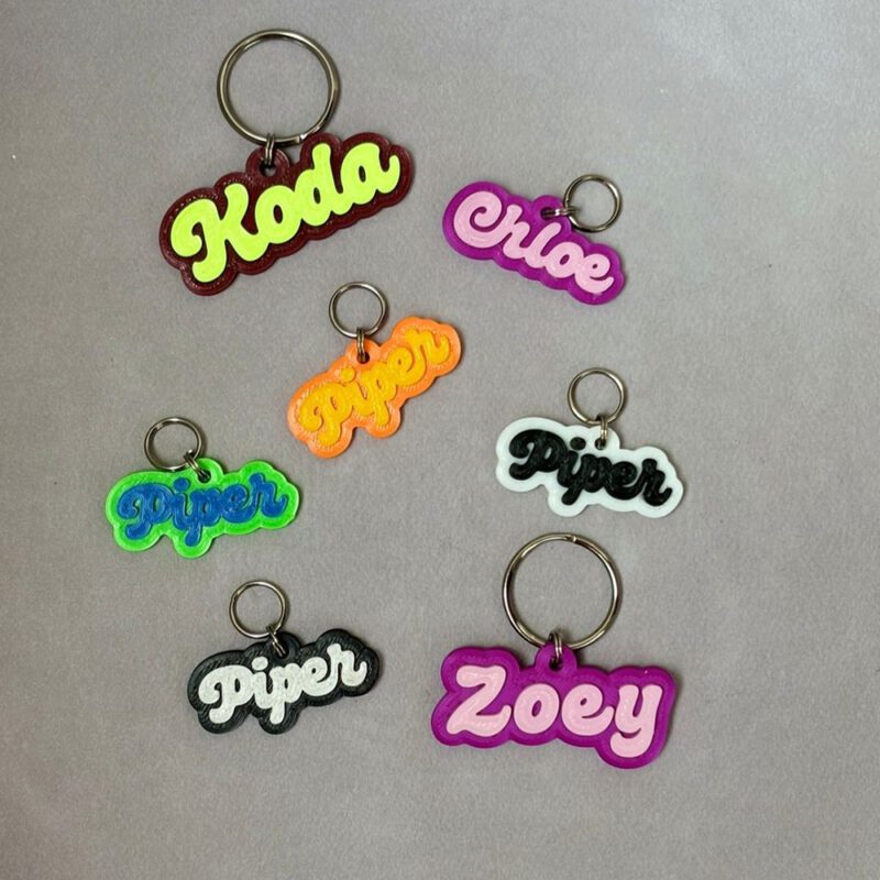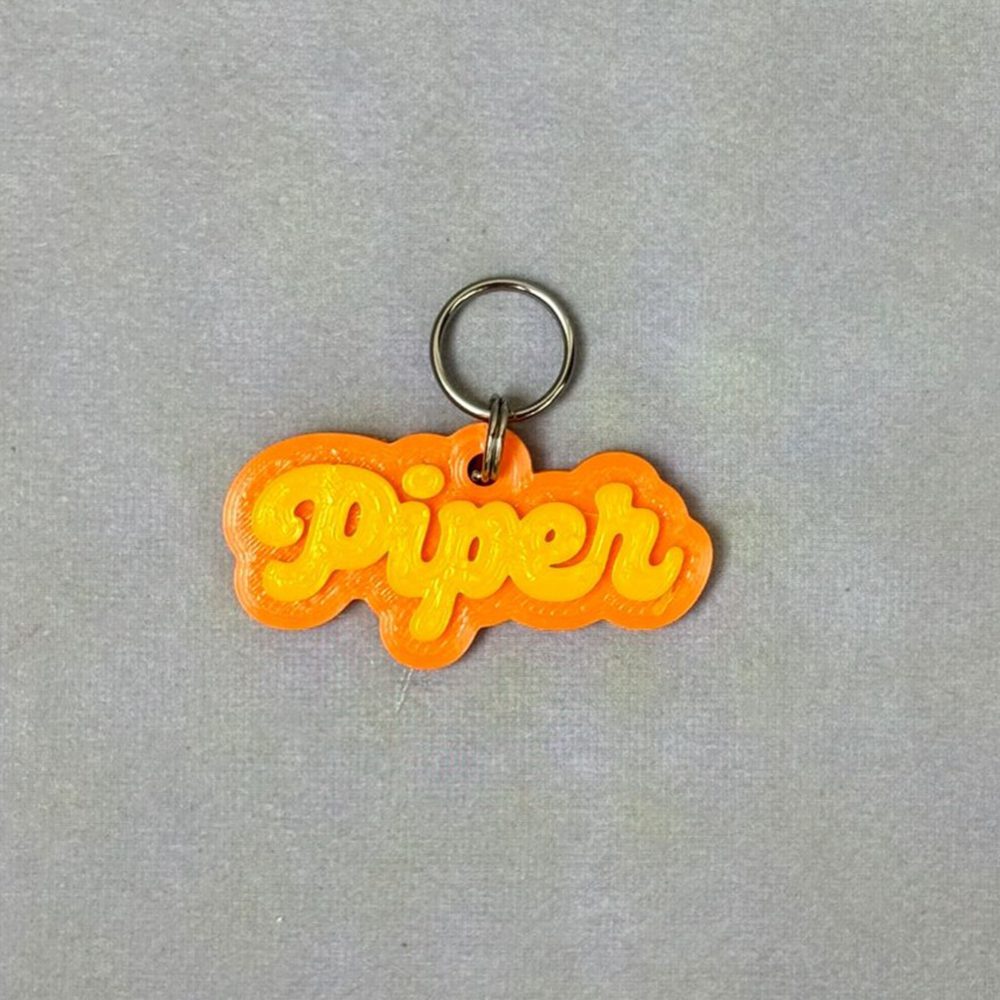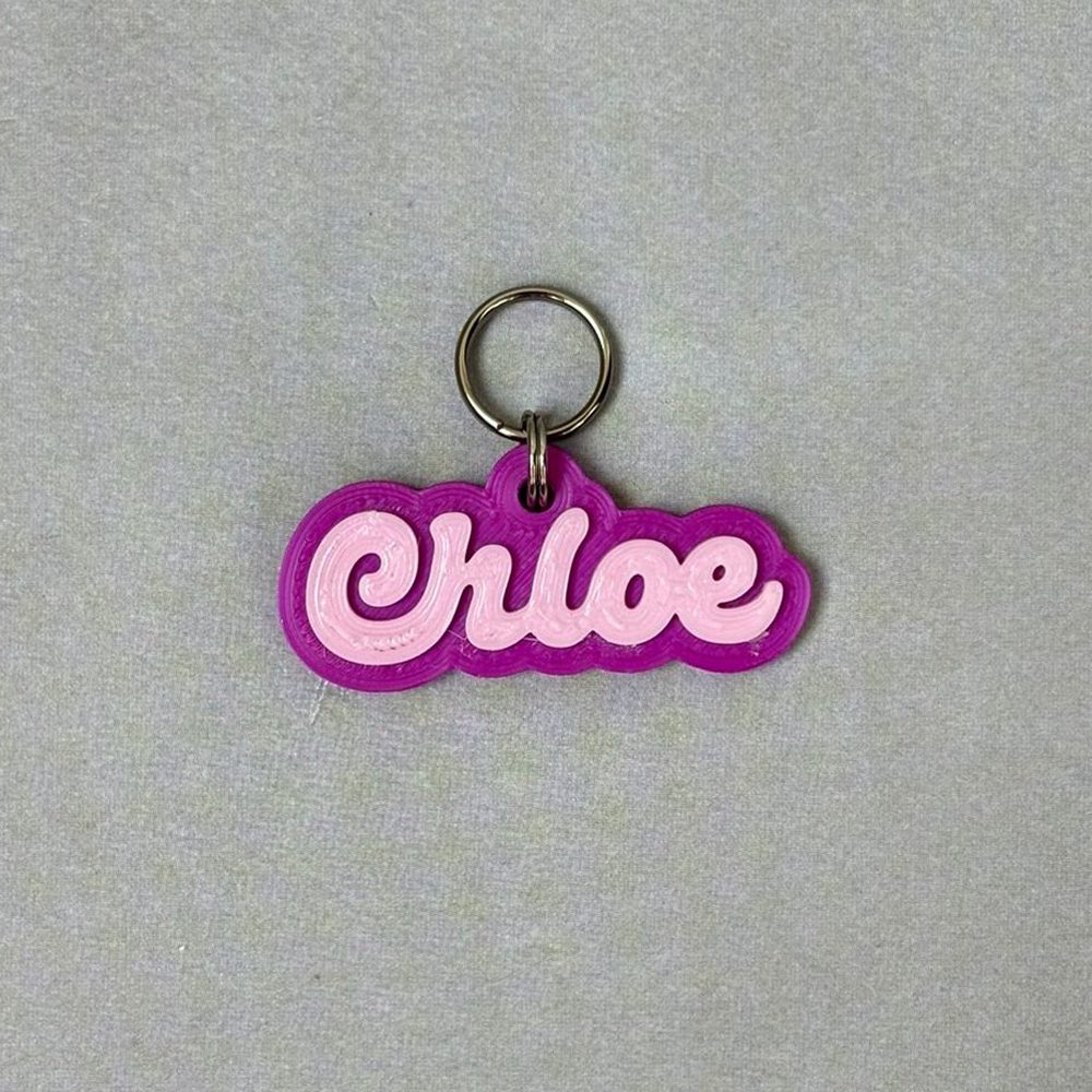 Produzida em PLA rígido e leve, é perfeita para tutores que buscam exclusividade e beleza. A versão 2 cores destaca o nome cursivo sobre fundo contrastante, realçando o design.