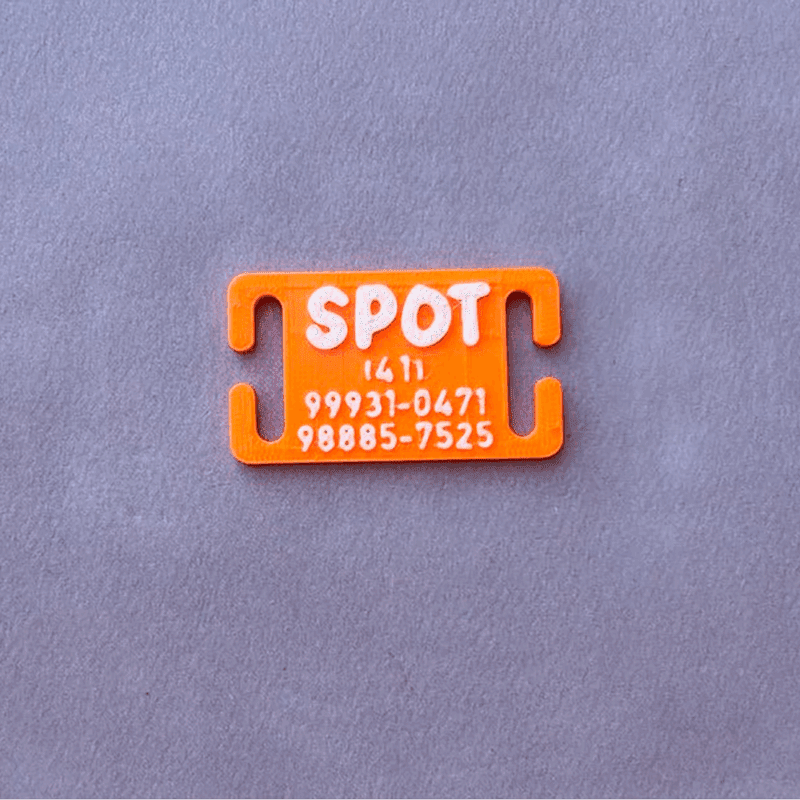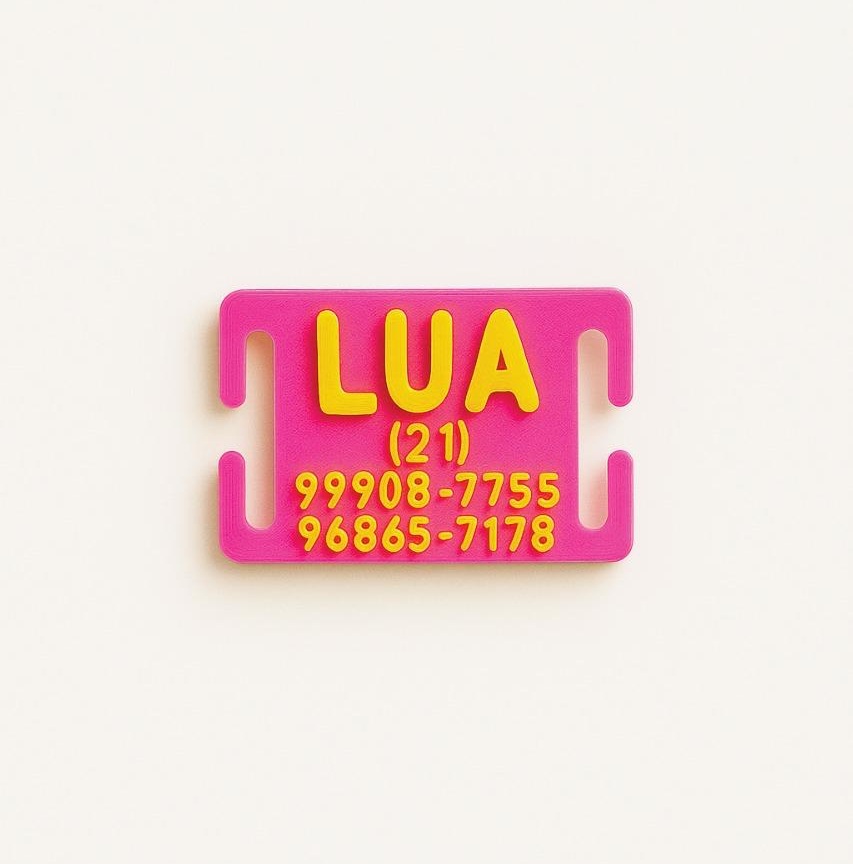 Fabricada em PLA rígido e atóxico com impressão 3D de alta precisão, é leve e confortável, pensada para o uso diário. A frente traz o nome do pet em alto relevo e comporta até dois números de telefone, garantindo legibilidade e durabilidade.